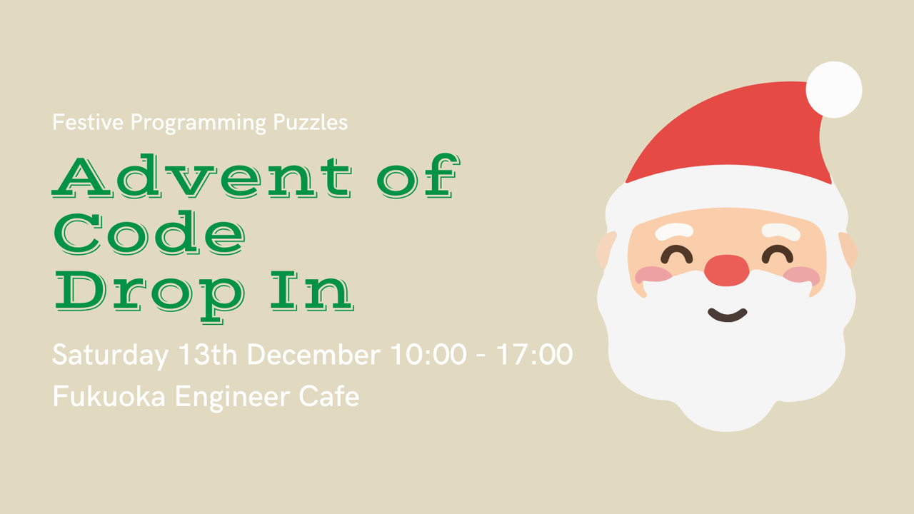 I thought it would be nice to have an offline get-together to work through the first week of Advent of Code. Maybe a bit of a long shot posting here, but if anyone is in Fukuoka, we will be meeting at Engineer Cafe on 8 December from 18:30. You can sign up here: