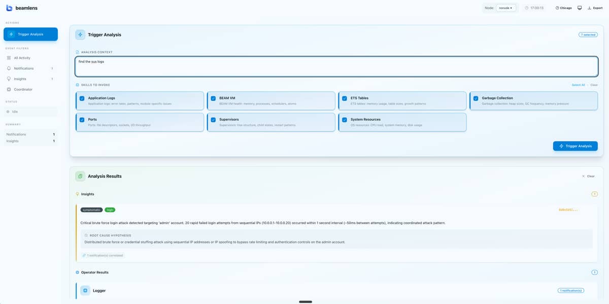 Out of the box, Beamlens provides skills for tracking BEAM health, ETS tables, garbage collection, and logging.