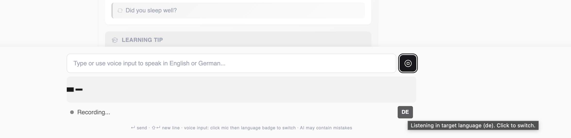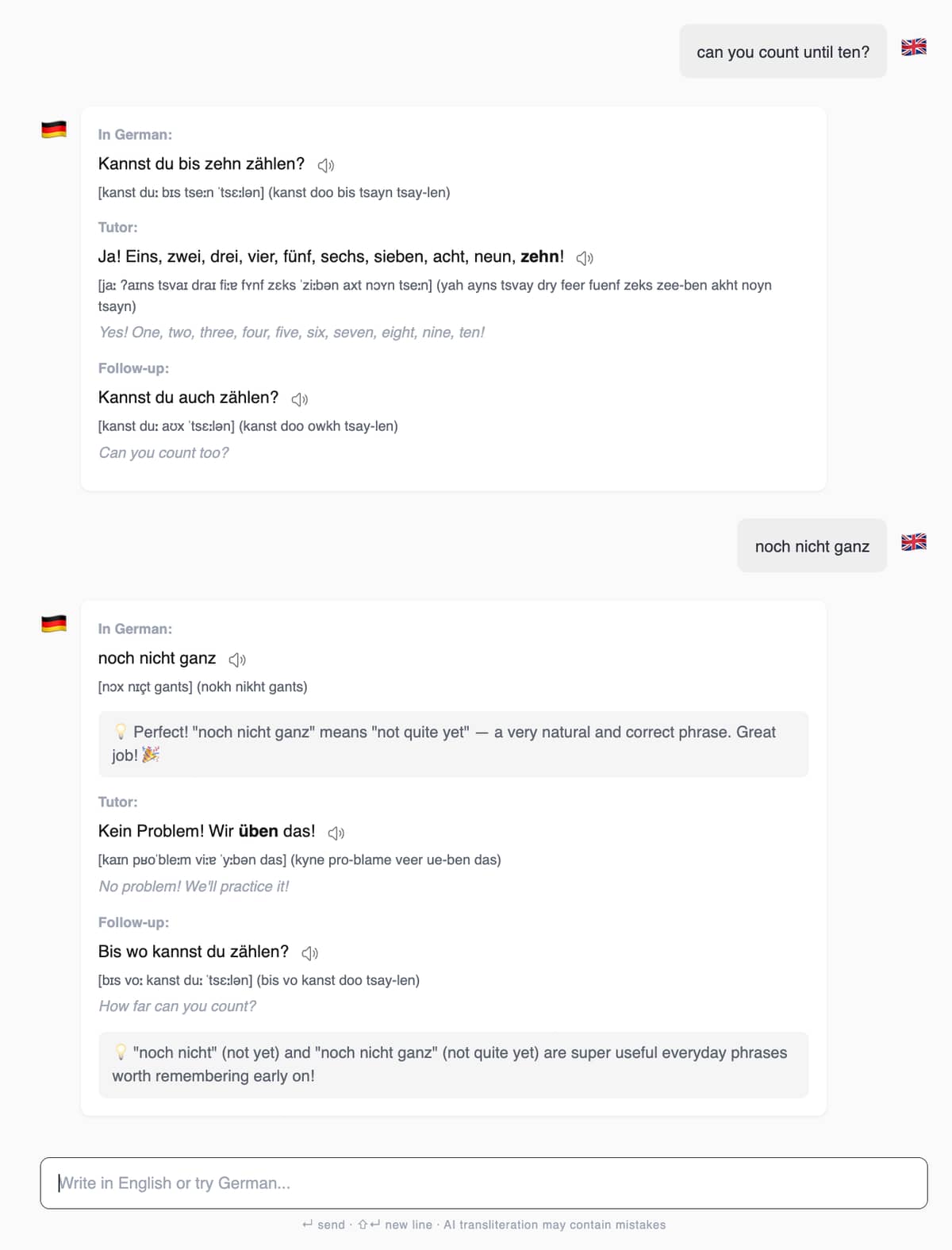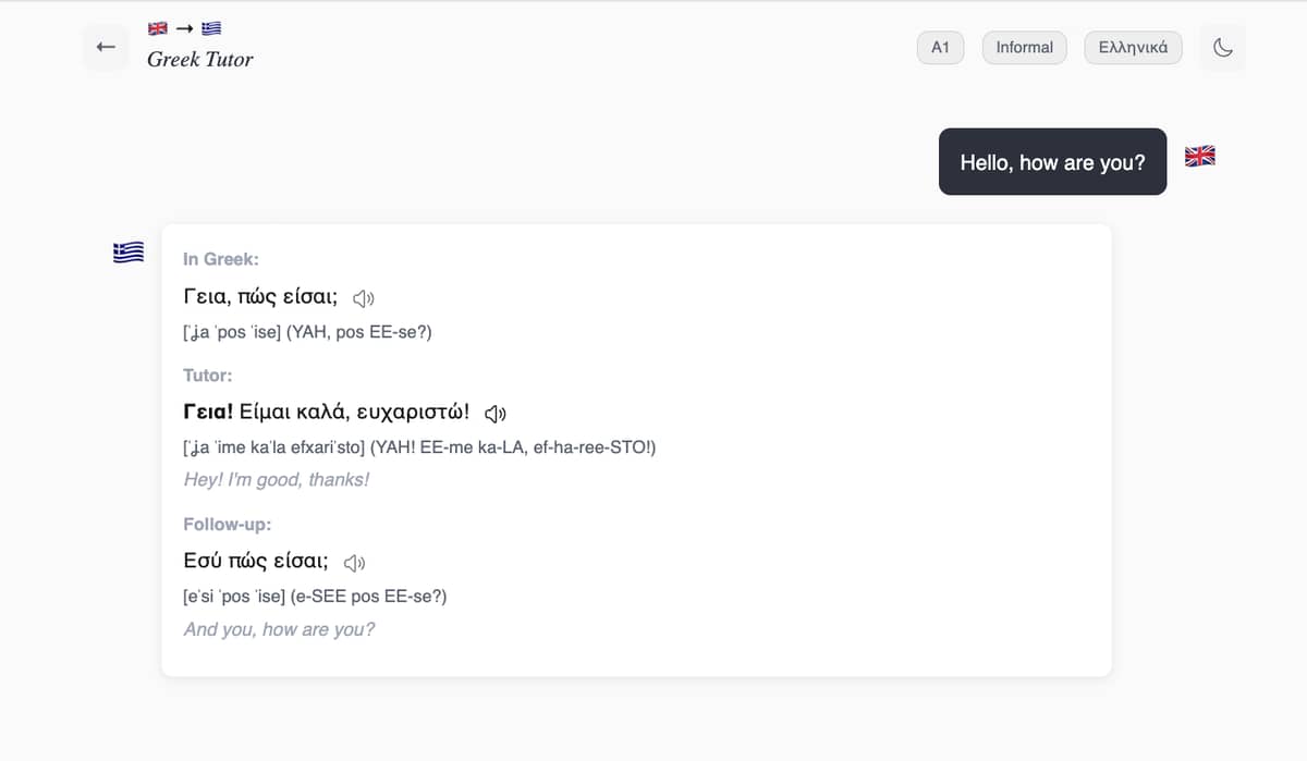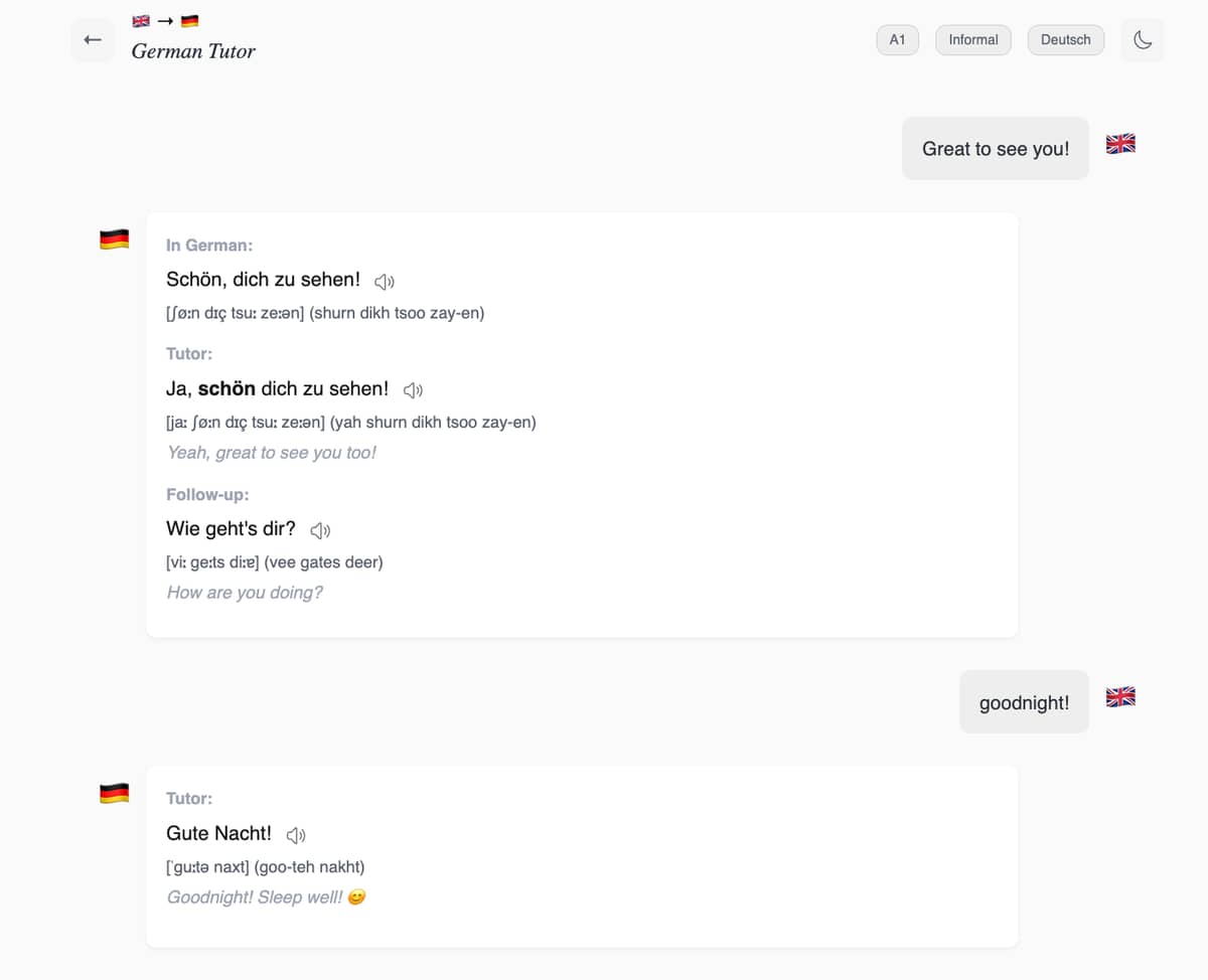 The app uses Claude Sonnet 4.6 via the Anthropic API to power the tutoring experience. The system prompt is carefully designed to enforce CEFR level constraints, maintain register consistency, and provide differentiated feedback based on whether the learner is practicing or just asking for translations.