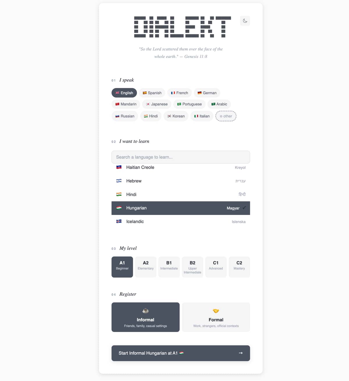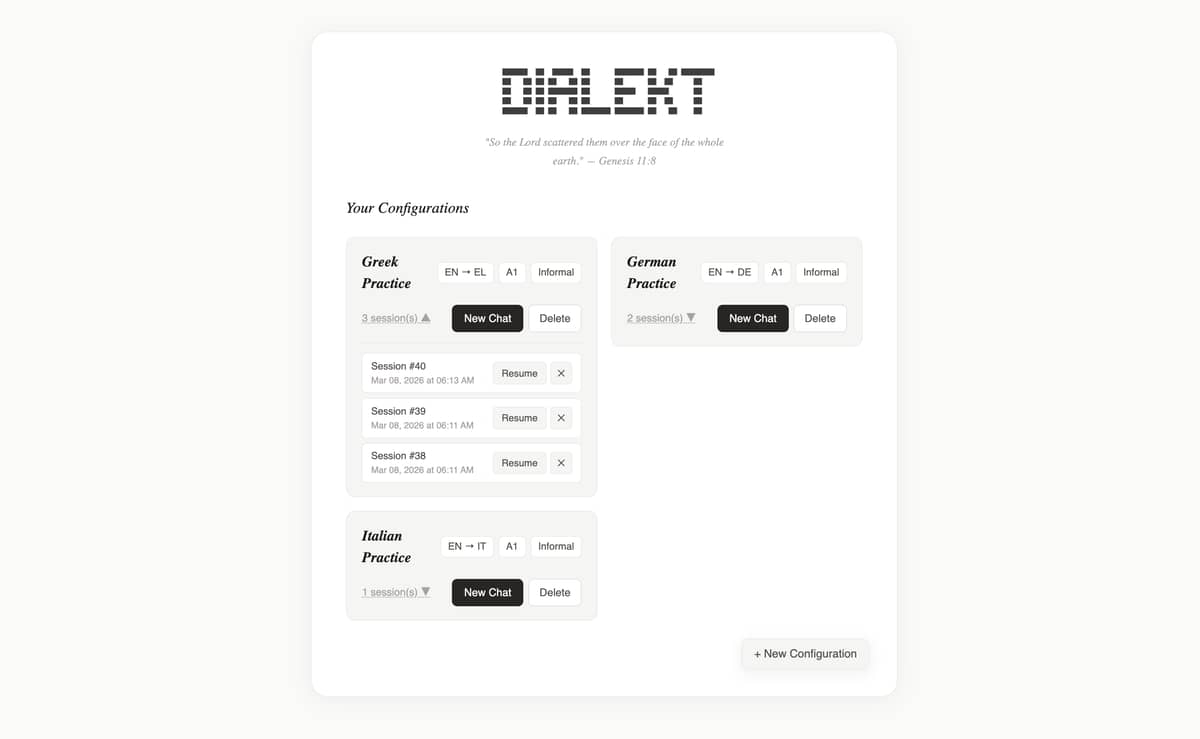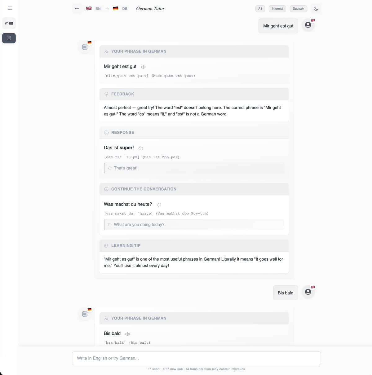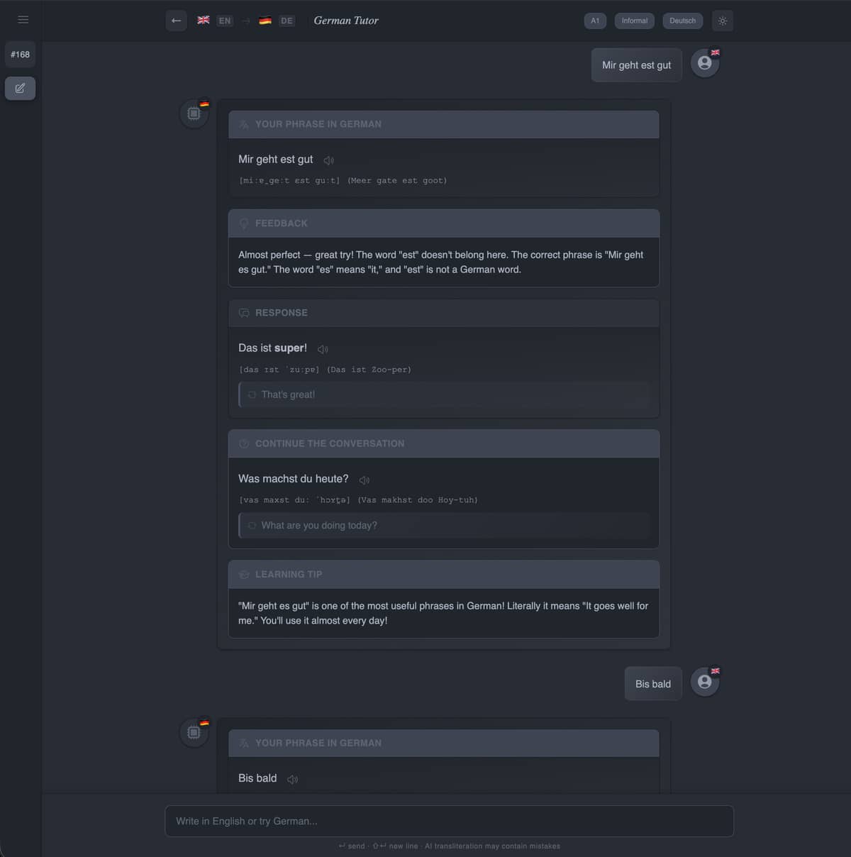 Dialekt pairs learners with an AI tutor (powered by Claude) that adjusts its responses based on the learner’s CEFR level (A1-C2) and chosen register (formal/informal). The tutor provides intelligent, context-aware feedback depending on how the learner communicates: