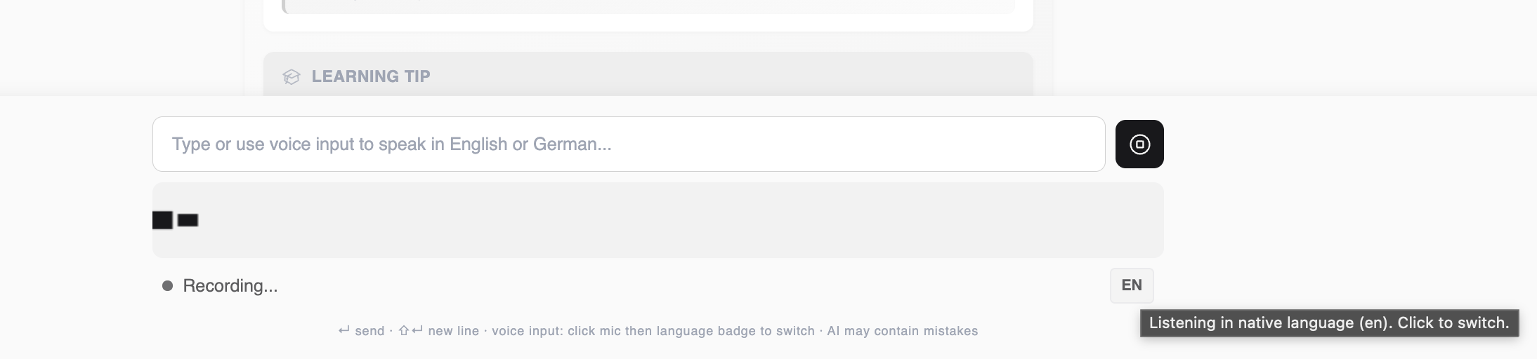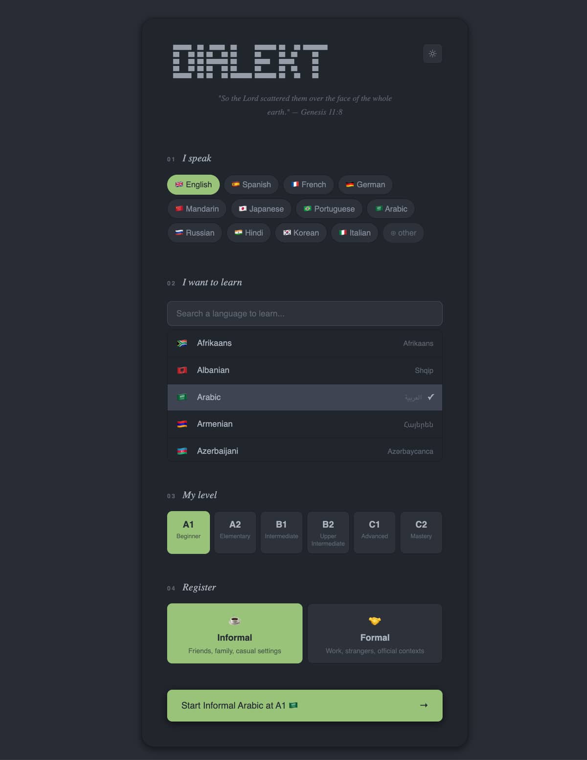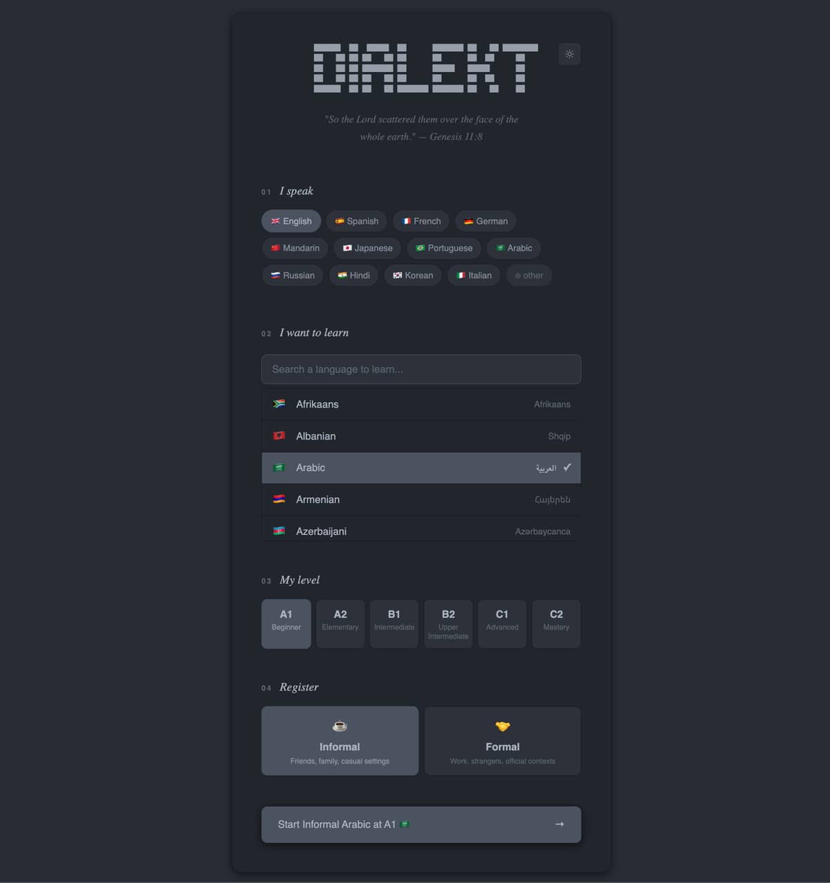 Dialekt pairs learners with an AI tutor (powered by Claude) that adjusts its responses based on the learner’s CEFR level (A1-C2) and chosen register (formal/informal). The tutor provides intelligent, context-aware feedback depending on how the learner communicates:
