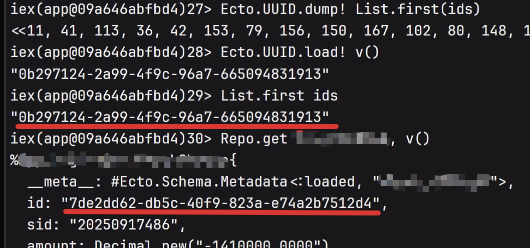 I also suspected something with ecto or auto generate, hence the test at the top, about uuid dumping and loading. All seems good. It almost seems a pg problem but that would be too crazy to be true.