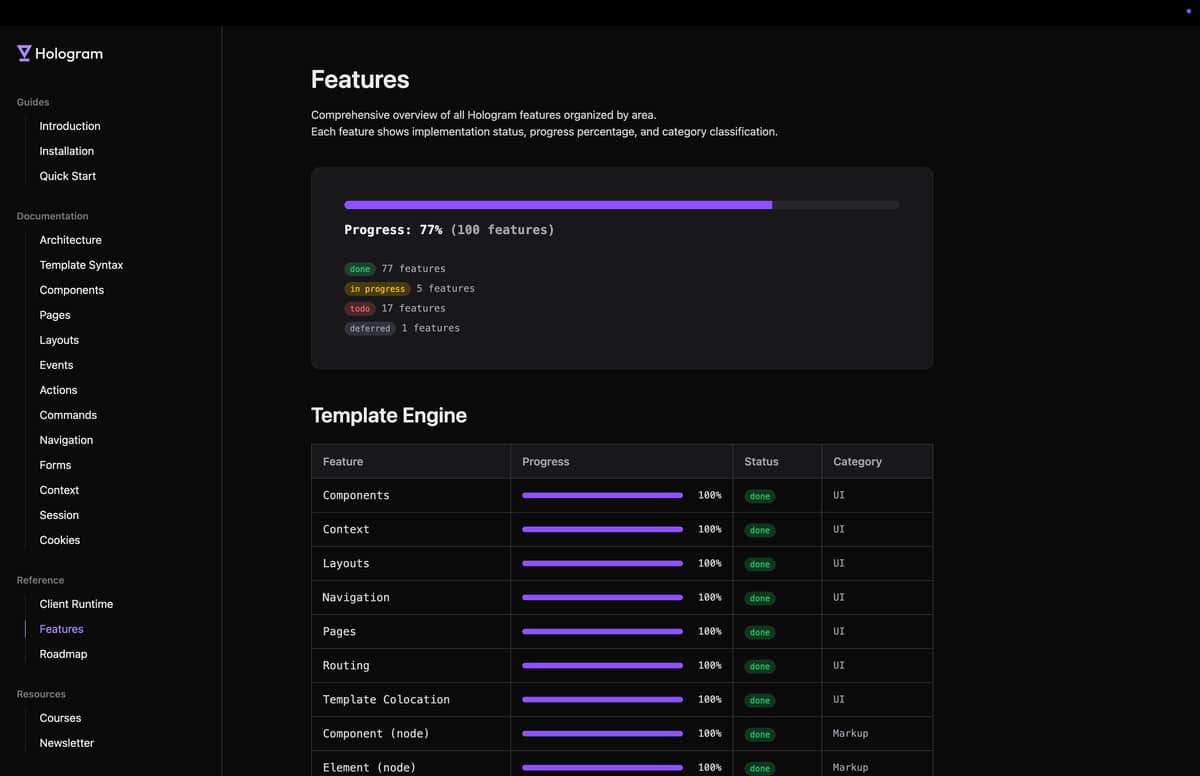 Features Page - Shows all implemented and in-progress features across Template Engine, Framework Runtime, Tooling, and Elixir Client Runtime. Each feature displays its status (done, in progress, todo, or deferred) with progress percentages.