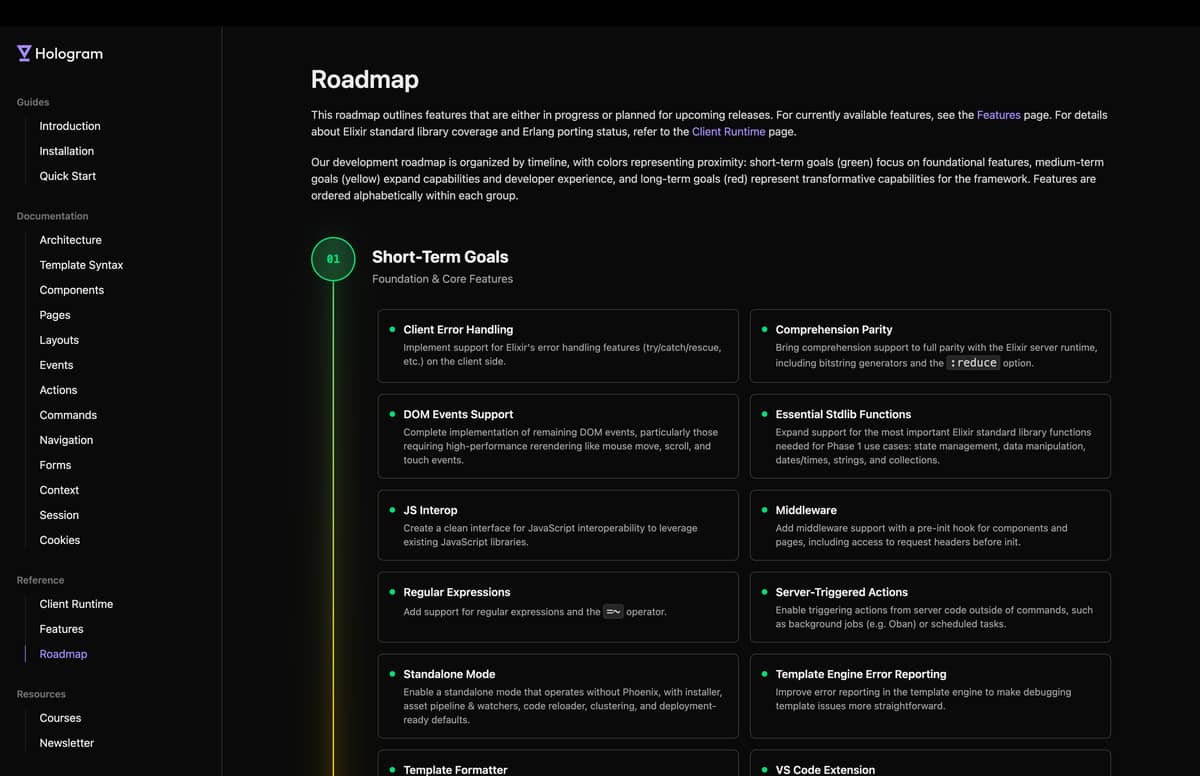 Roadmap Page - Now focuses exclusively on planned features, organized by timeline (short-term, medium-term, and long-term goals) with a visual gradient timeline showing proximity to implementation.