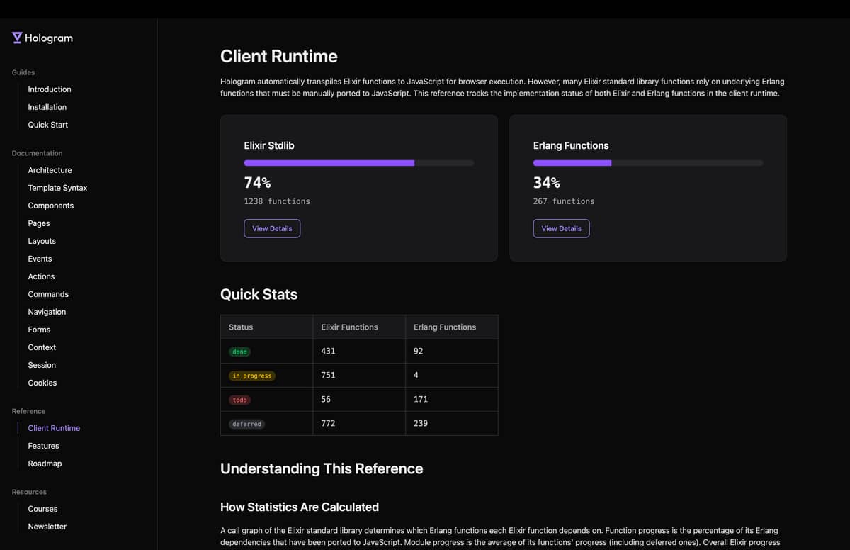 The Client Runtime Reference was recently added (forum announcement), tracking over 100 Elixir standard library modules with per-function coverage status and Erlang functions porting status.