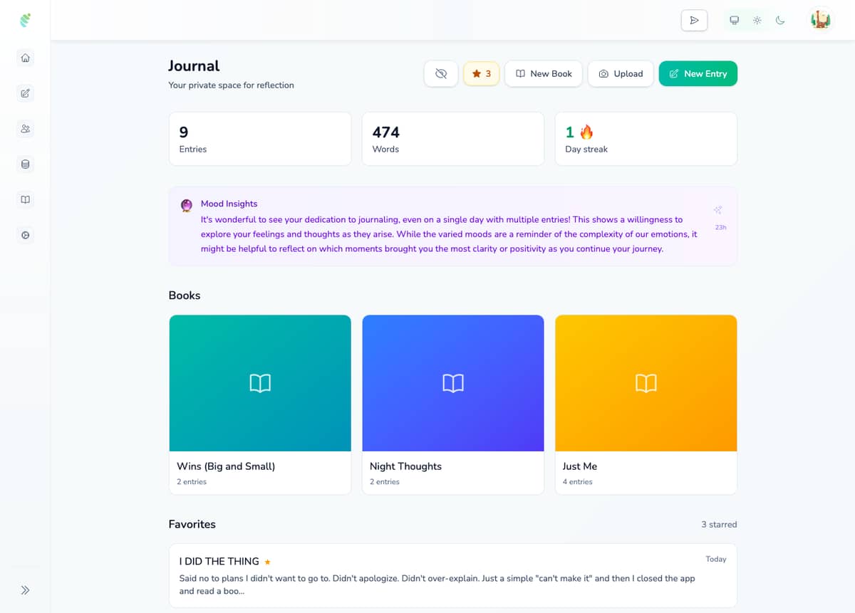 - Track your progress: See your total entries, word count, and current writing streak right on your dashboard. Small wins matter.