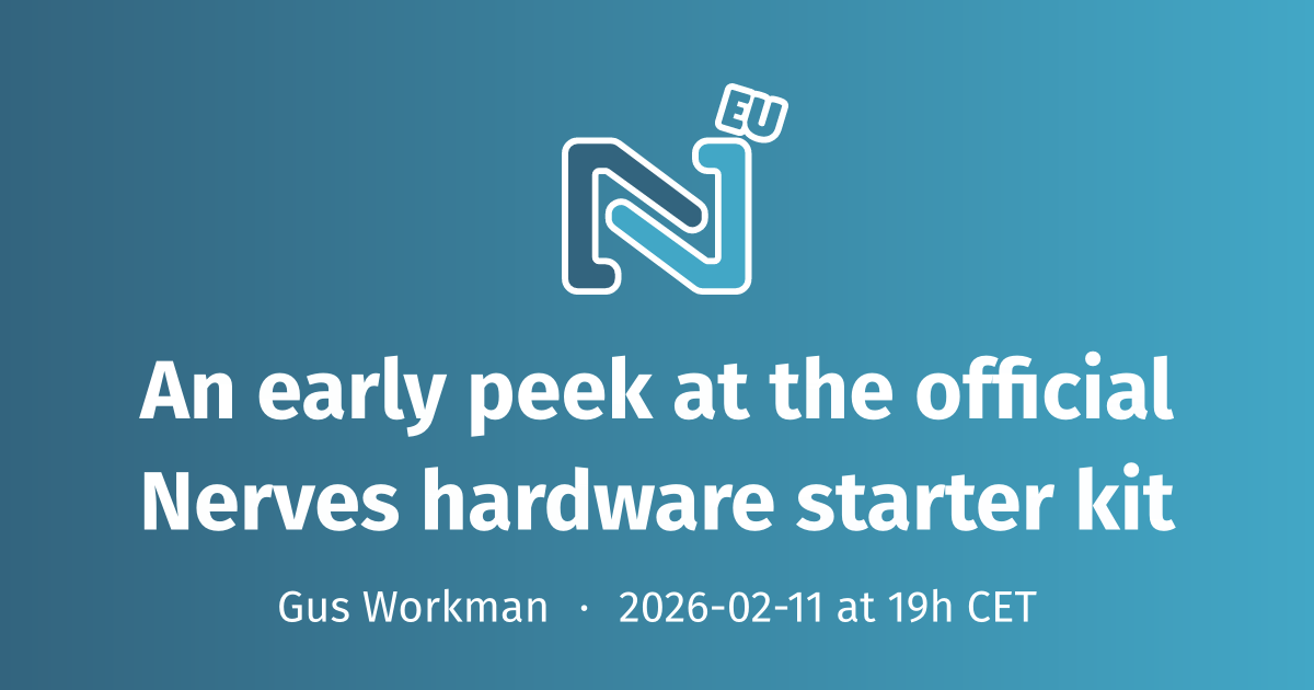 Our next meetup is today (Wednesday Feb. 11), at 19h CET via Zoom! Our speaker this month is yours truly, and I’ll be presenting on the progress of the first official Nerves starter kit, to be released in the coming months. Come join us for a discussion on the project, and stick around for our “social hour” afterwards. As usual, you can find the sign up link on the website: