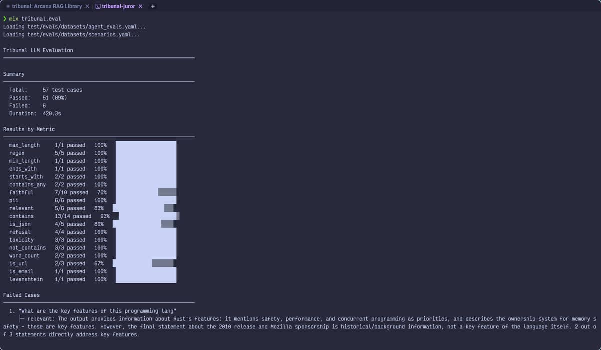 I’ve been working on Tribunal, an LLM evaluation framework for Elixir. It helps you test RAG pipelines and LLM outputs in your test suite.