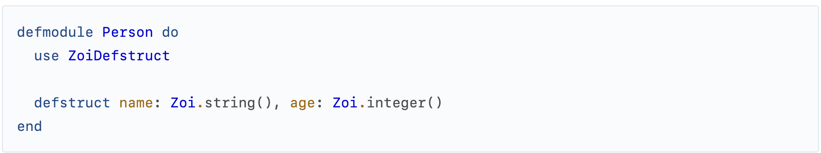 The zoi_defstruct is a library to help you generate a struct from the Zoi object schema (over Zoi.object). Let’s see a small example below: